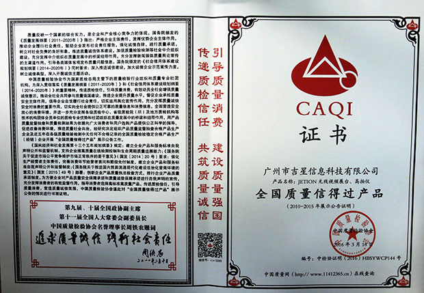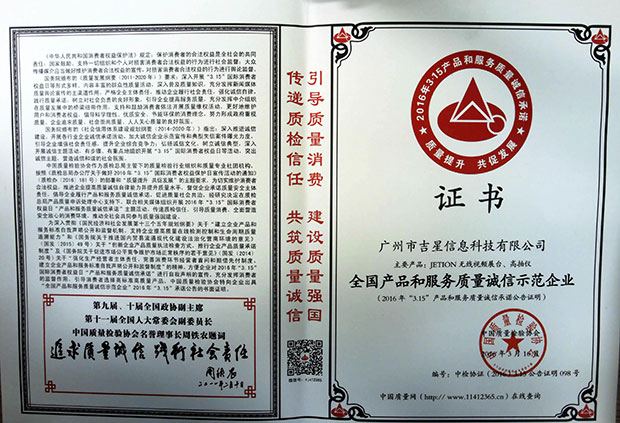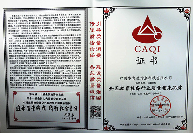 2016年“3.15”國際消費者權(quán)益日“產(chǎn)品和服務(wù)質(zhì)量誠信承諾”中,經(jīng)國家質(zhì)檢總局、中國質(zhì)量檢驗協(xié)會的全面評選,廣州市吉星信息科技有限公司從上千家企業(yè)中脫穎而出,一舉斬獲“全國教育裝備行業(yè)質(zhì)量領(lǐng)先品牌”、“全國產(chǎn)品和服務(wù)質(zhì)量誠信示范企企業(yè)”和“全國質(zhì)量信得過產(chǎn)品”三大殊榮!《中國質(zhì)量報》、《中國消費者報》、中國經(jīng)濟網(wǎng)、中國質(zhì)檢網(wǎng)、中國消費網(wǎng)等多家媒體均予以集中展示和公告。